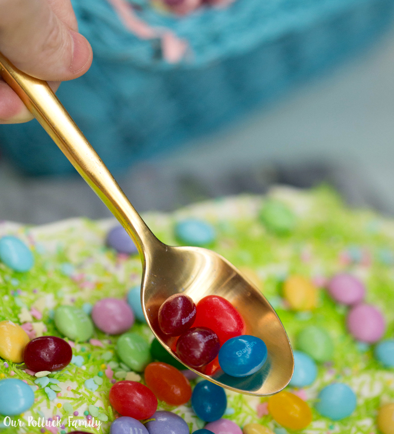 Now to the fun part: decorating. Begin by adding lots of colorful springtime sprinkles over the vanilla frosting. Then add your favorite candies, like M&M’S® Milk Chocolate and Starburst® Jelly Beans. I love all the fun Easter colors!