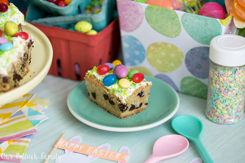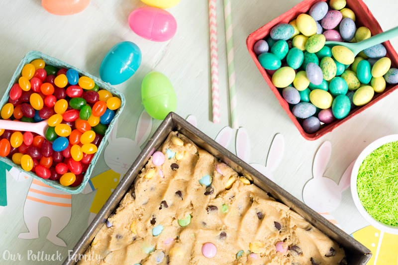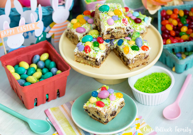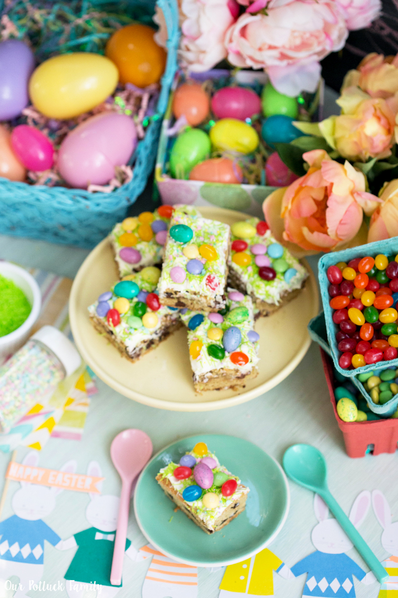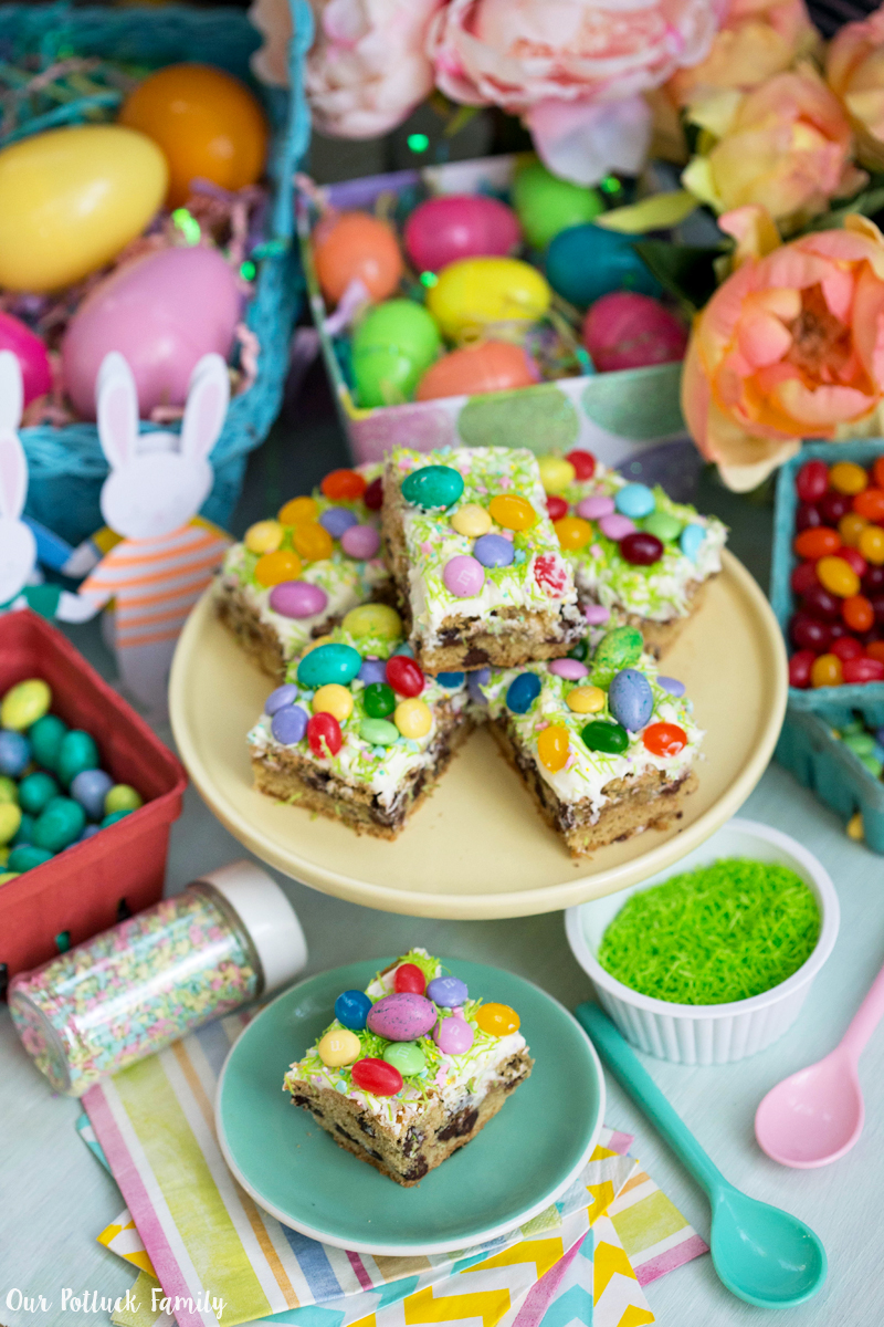 Cut your blondies into 12 separate pieces and enjoy! These would make a great centerpiece for your Easter dessert table, filled with plastic eggs, pretend grass, colorful flowers, and all of your other fun springtime decorations.