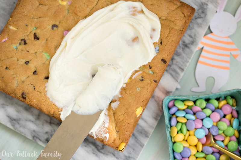 Remove the blondies from the oven and allow them to cool completely. When they are completely cooled, remove the entire square of blondies and place on a cutting board. While I love homemade buttercream on cakes, I actually like using pre-made vanilla frosting for this recipe. Frost the entire blondie.